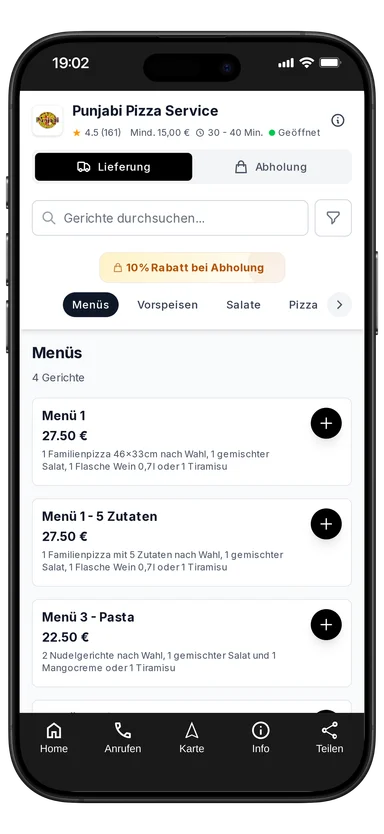 1 Familienpizza mit 5 Zutaten nach Wahl, 1 gemischter Salat, 1 Flasche Wein 0,7l oder 1 Tiramisu